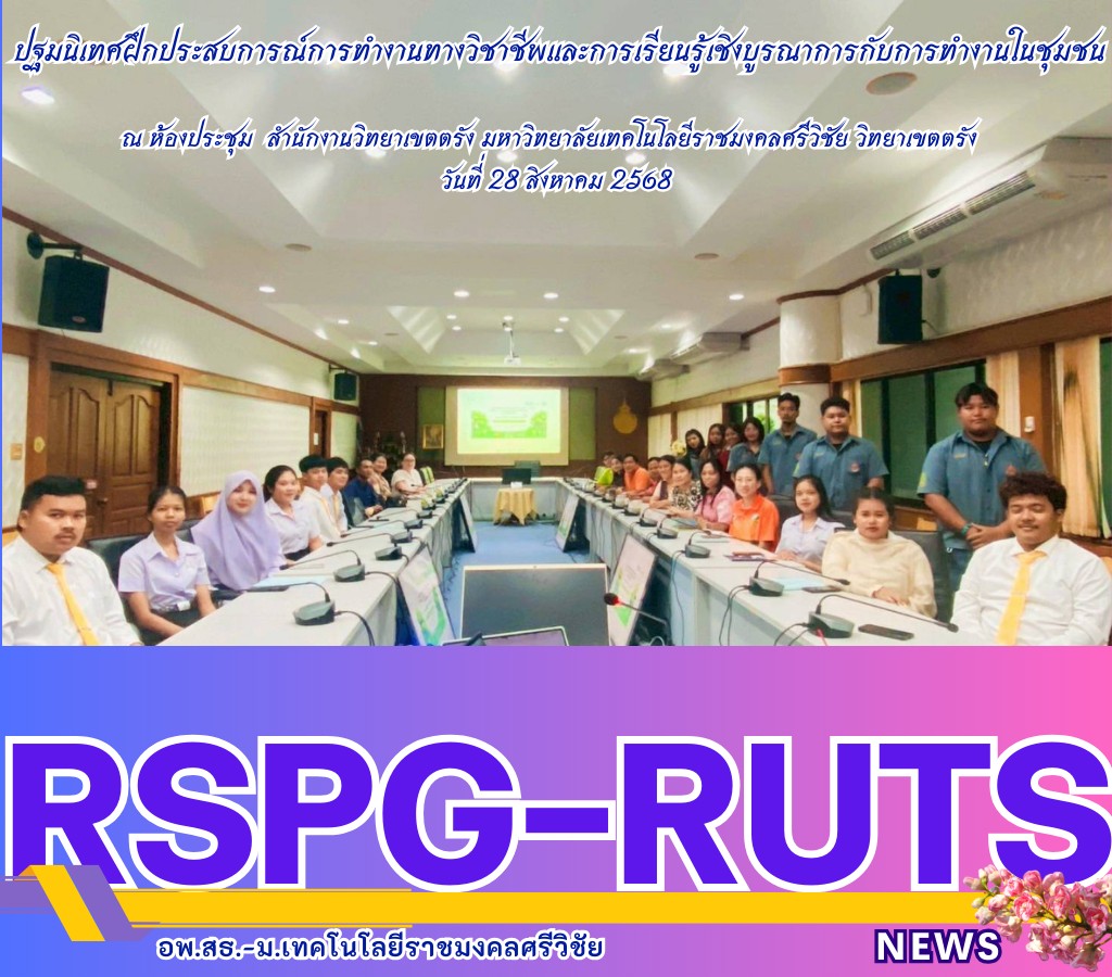 วันที่ 28 สิงหาคม 2568 รองศาสตราจารย์ ดร.ลักษมี วิทยา รองผู้อำนวยการสถาบันวิจัยและพัฒนา มอบหมายให้ นางสาววารีรัตน์ ขุนทอง และนายรุ่งโรจน์ นวนศรี เจ้าหน้าที่ศูนย์ประสานงาน อพ.สธ.-มทร.ศรีวิชัย เข้าร่วมปฐมนิเทศฝึกประสบการณ์การทำงานทางวิชาชีพและการเรียนรู้เชิงบูรณาการกับการทำงานในชุมชน ของนักศึกษาชั้นปีที่ 4 สาขาวิชาการจัดการทรัพยากรและสิ่งแวดล้อม ณ ห้องประชุมสำนักวิทยาเขตตรัง มหาวิทยาลัยเทคโนโลยีราชมงคลศรีวิชัย วิทยาเขตตรัง สืบเนื่องด้วยคณะวิทยาศาสตร์และเทคโนโลยีการประมงมหาวิทยาลัยเทคโนโลยีราชมงคลศรีวิชัย วิทยาเขตตรัง ได้จัดการเรียนการสอนรูปแบบการฝึกประสบการณ์วิชาชีพ (WIL) ในรายวิชาการเรียนรู้เชิงบูรณาการกับการทำงานในชุมชน โดยเน้นให้นักศึกษานำความรู้ทั้งทฤษฏีและปฏิบัติที่ได้ศึกษามาไปประยุกต์ใช้และปฏิบัติงานจริงในสถานประกอบการ ซึ่งคณะฯ พิจารณาแล้วเห็นว่า ศูนย์ประสานงาน อพ.สธ.-มทร.ศรีวิชัย เป็นแหล่งที่จะเพิ่มพูนความรู้ ทักษะ และประสบการณ์ให้แก่นักศึกษาได้เป็นอย่างดี จึงส่งนักศึกษา จำนวน 3 ราย เข้าฝึกงานตั้งแต่วันที่ 1 กันยายน – 224 ตุลาคม 2568