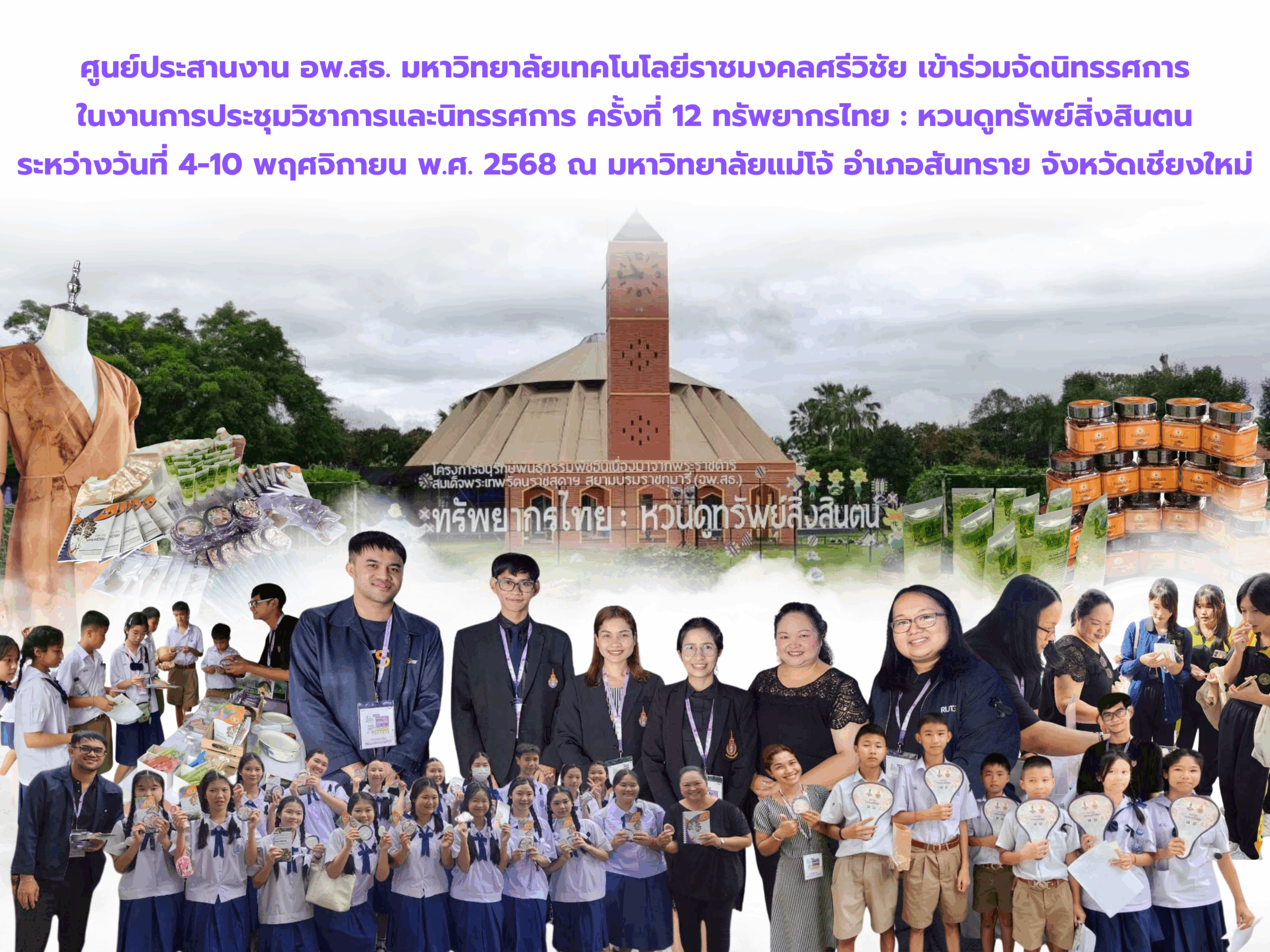 เมื่อวันที่ 4–10 พฤศจิกายน 2568 ที่ผ่านมา ศูนย์ประสานงาน อพ.สธ.-มหาวิทยาลัยเทคโนโลยีราชมงคลศรีวิชัย เข้าร่วมจัดนิทรรศการในการประชุมวิชาการและนิทรรศการ ครั้งที่ 12 “ทรัพยากรไทย : หวนดูทรัพย์สิ่งสินตน” ณ มหาวิทยาลัยแม่โจ้ จังหวัดเชียงใหม่ โดยมี สมเด็จพระกนิษฐาธิราชเจ้า กรมสมเด็จพระเทพรัตนราชสุดาฯ สยามบรมราชกุมารี เสด็จพระราชดำเนินเป็นองค์ประธานเปิดการประชุม