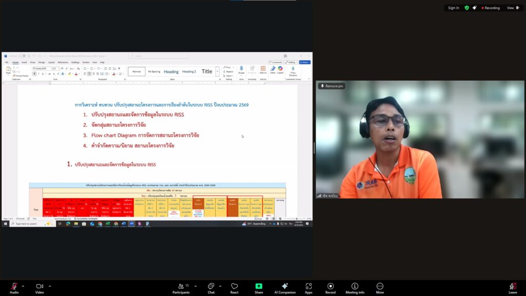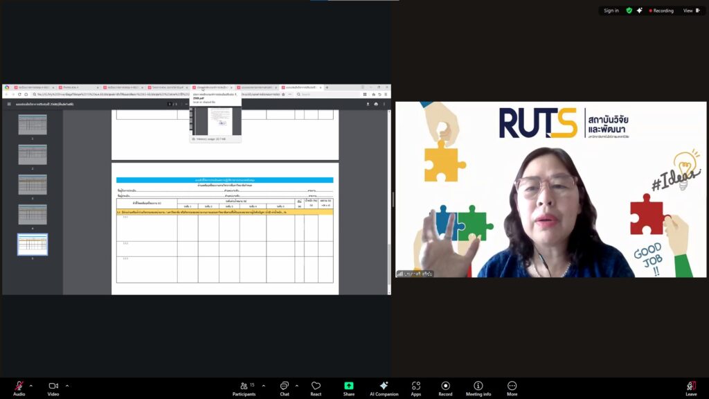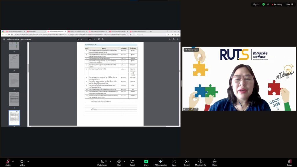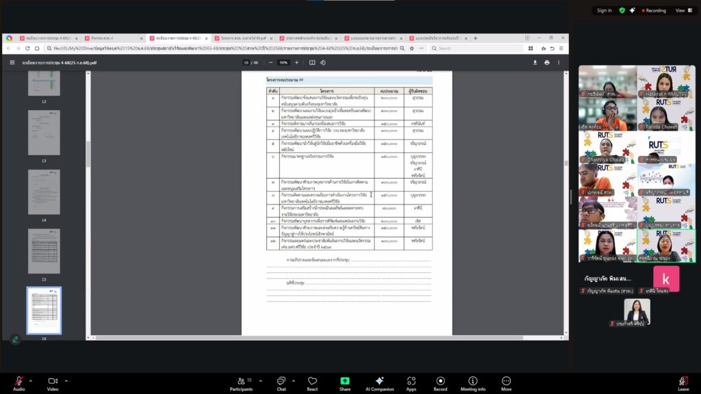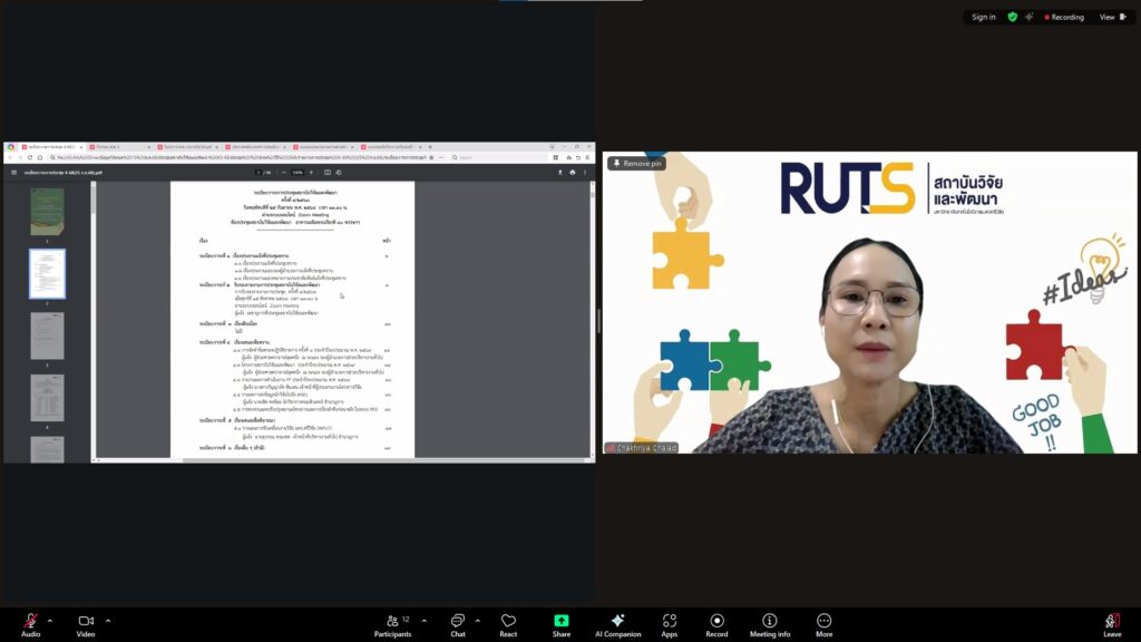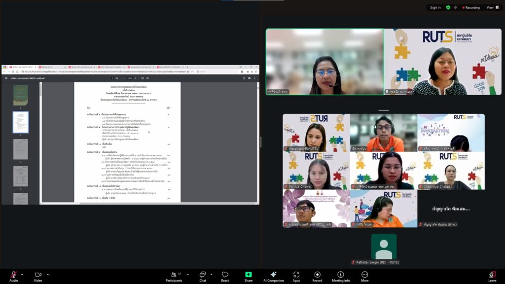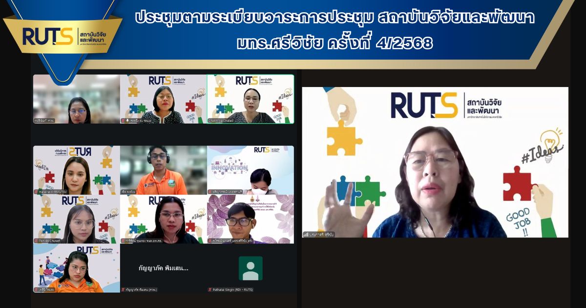 วันที่ 25 กันยายน 2568 สถาบันวิจัยและพัฒนา มทร.ศรีวิชัย นำโดย ผศ.ประภาศรี ศรีชัย ผู้อำนวยการสถาบันวิจัยและพัฒนา ผศ.ดร.สุดคนึง ณ ระนอง ผศ.ดร.ชาคริยา ฉลาด รองผู้อำนวยการสถาบันวิจัยและพัฒนา พร้อมด้วยเจ้าหน้าที่ของสถาบันวิจัยและพัฒนา ประชุมตามระเบียบวาระการประชุม สถาบันวิจัยและพัฒนา มทร.ศรีวิชัย ครั้งที่ 4/2568 เพื่อวางแผนการดำเนินงานสถาบันวิจัยและพัฒนา และรายงานผลการดำเนินงานของสถาบันวิจัยและพัฒนาร่วมกัน ผ่านสื่ออิเล็กทรอนิกส์แอปพลิเคชั่น ZOOM Cloud Meetings