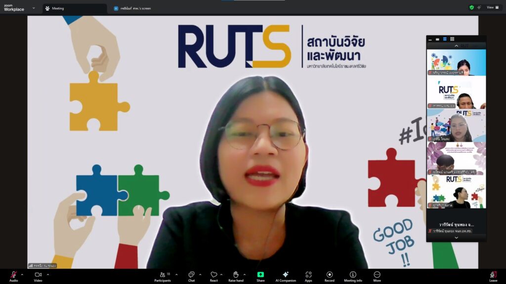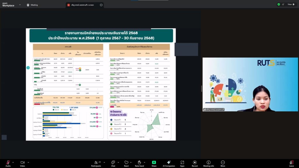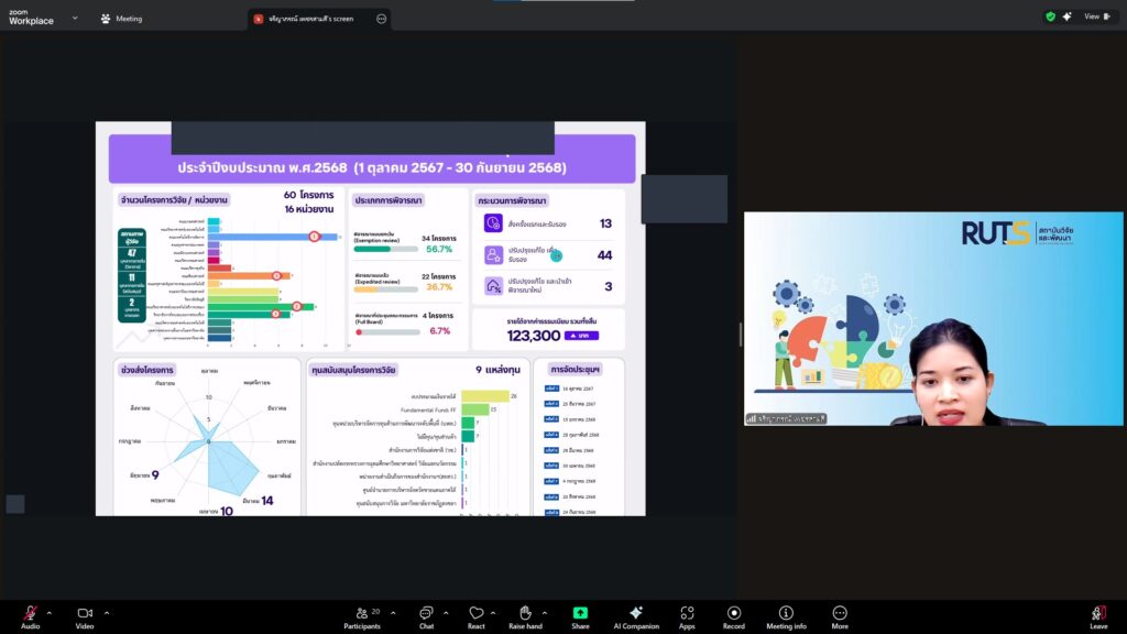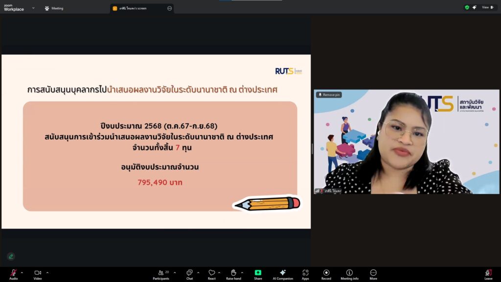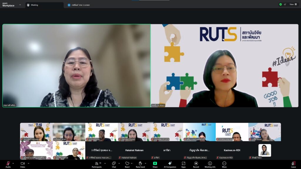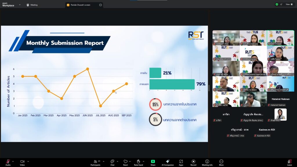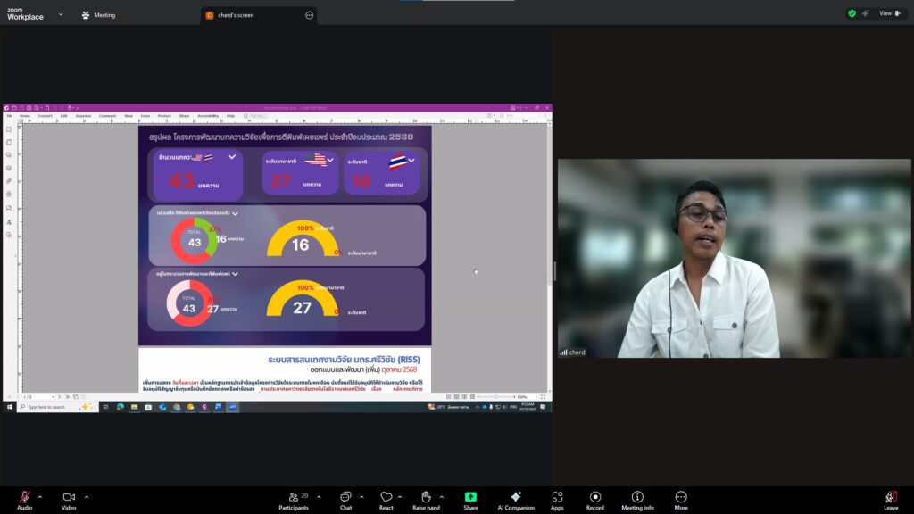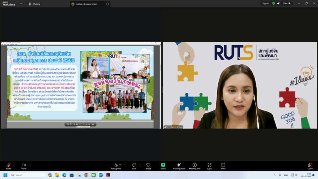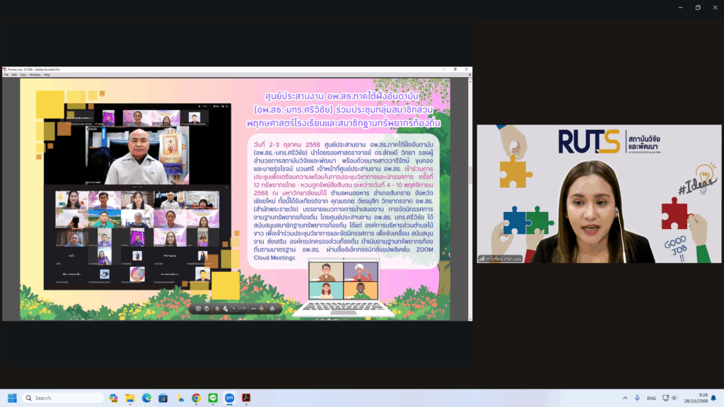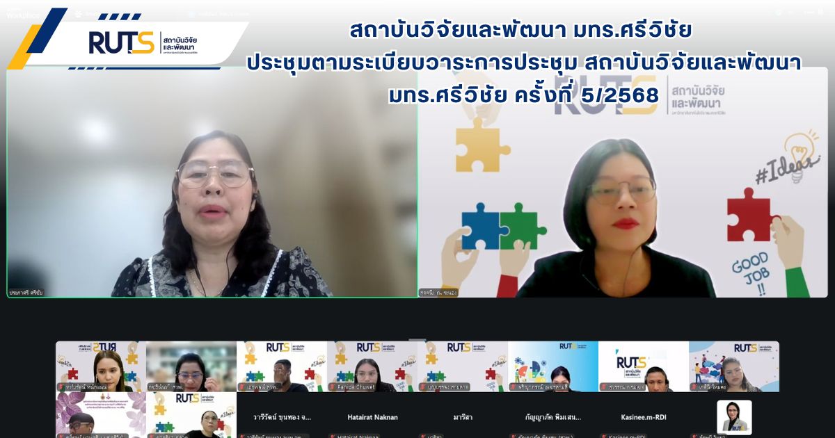 วันที่ 28 ตุลาคม 2568 สถาบันวิจัยและพัฒนา มทร.ศรีวิชัย นำโดย ผศ.ประภาศรี ศรีชัย ผู้อำนวยการสถาบันวิจัยและพัฒนา ผศ.ดร.สุดคนึง ณ ระนอง ผศ.ดร.ชาคริยา ฉลาด รศ.ดร.ลักษมี วิทยา รองผู้อำนวยการสถาบันวิจัยและพัฒนา พร้อมด้วยเจ้าหน้าที่ของสถาบันวิจัยและพัฒนา ประชุมตามระเบียบวาระการประชุม สถาบันวิจัยและพัฒนา มทร.ศรีวิชัย ครั้งที่ 5/2568 เพื่อติดตามการดำเนินงานด้านวิจัยของแต่ละฝ่ายงาน รวมถึงการวางแผนดำเนินโครงการของสถาบันวิจัยและพัฒนา ผ่านสื่ออิเล็กทรอนิกส์แอปพลิเคชั่น ZOOM Cloud Meetings