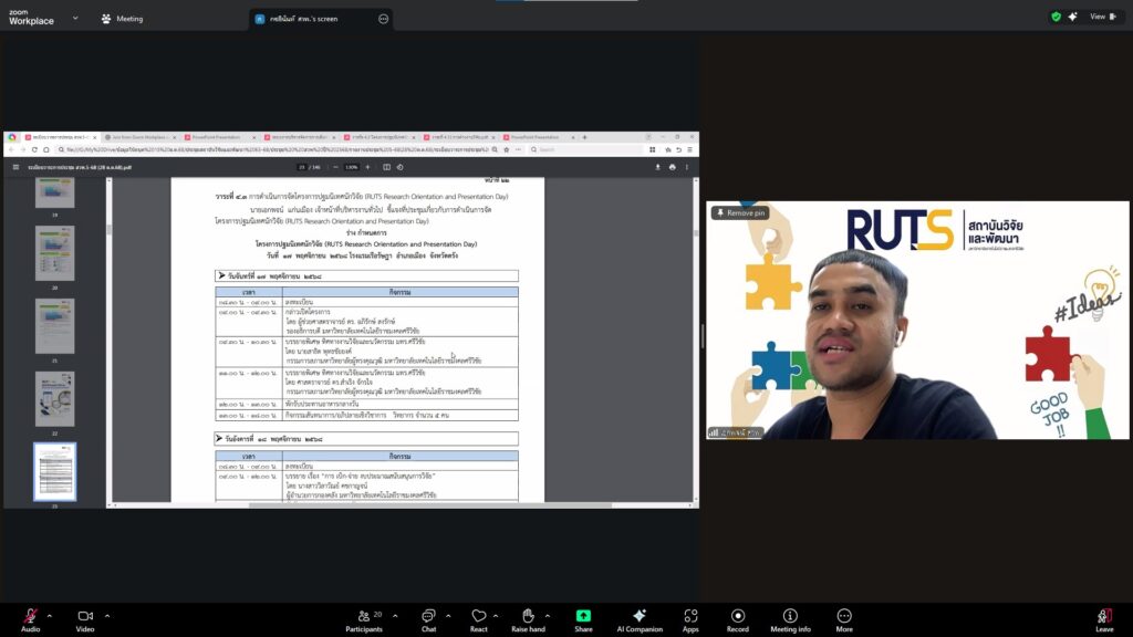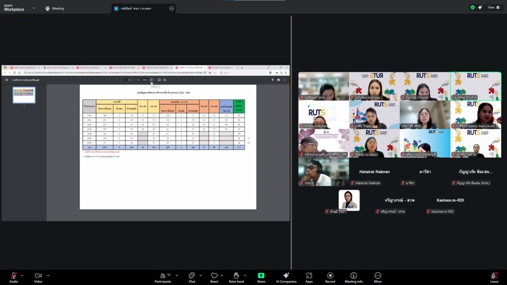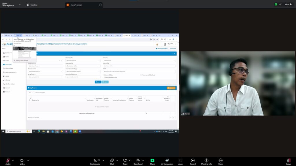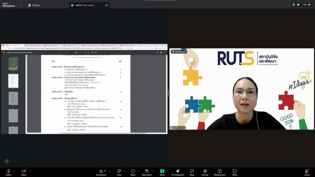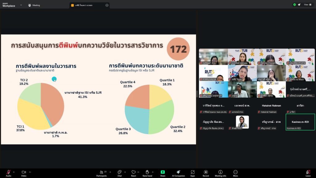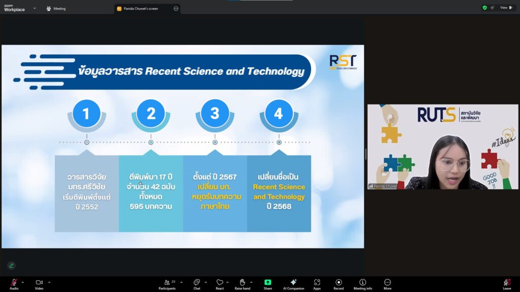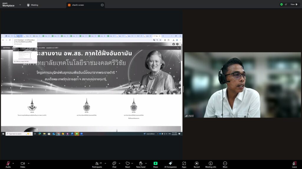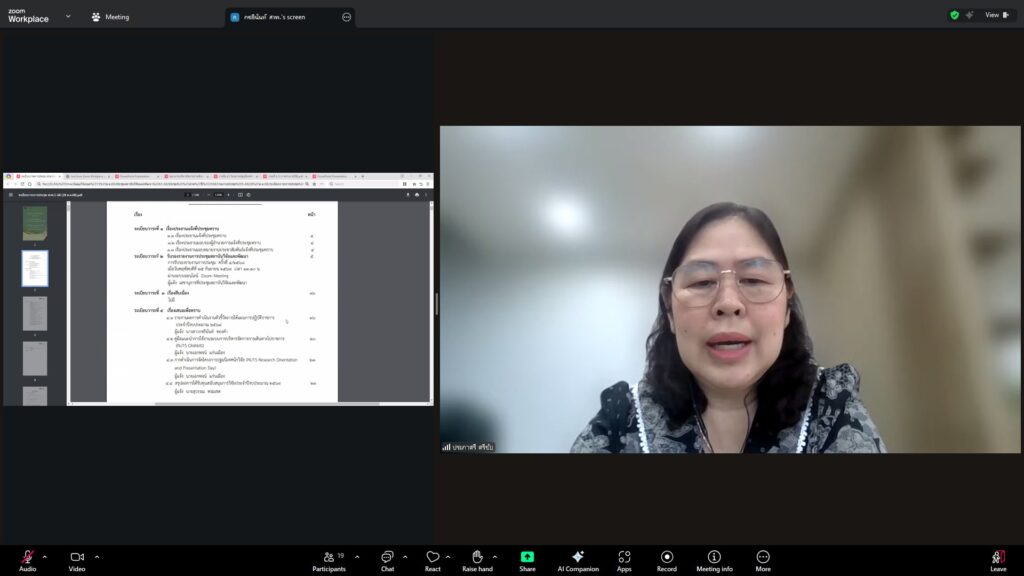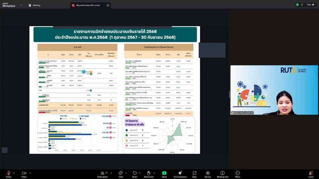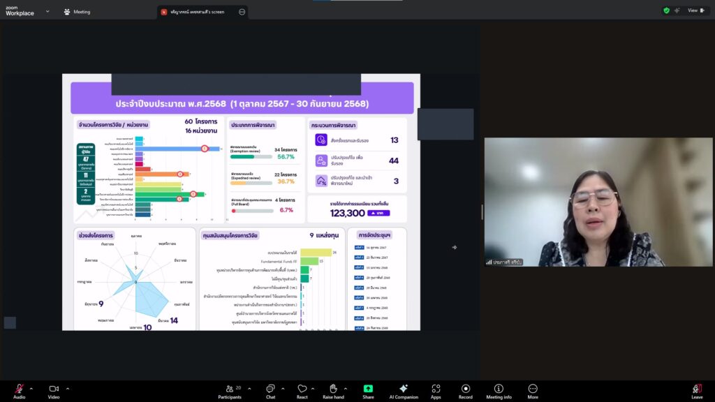 วันที่ 28 ตุลาคม 2568 สถาบันวิจัยและพัฒนา มทร.ศรีวิชัย นำโดย ผศ.ประภาศรี ศรีชัย ผู้อำนวยการสถาบันวิจัยและพัฒนา ผศ.ดร.สุดคนึง ณ ระนอง ผศ.ดร.ชาคริยา ฉลาด รศ.ดร.ลักษมี วิทยา รองผู้อำนวยการสถาบันวิจัยและพัฒนา พร้อมด้วยเจ้าหน้าที่ของสถาบันวิจัยและพัฒนา ประชุมตามระเบียบวาระการประชุม สถาบันวิจัยและพัฒนา มทร.ศรีวิชัย ครั้งที่ 5/2568 เพื่อติดตามการดำเนินงานด้านวิจัยของแต่ละฝ่ายงาน รวมถึงการวางแผนดำเนินโครงการของสถาบันวิจัยและพัฒนา ผ่านสื่ออิเล็กทรอนิกส์แอปพลิเคชั่น ZOOM Cloud Meetings