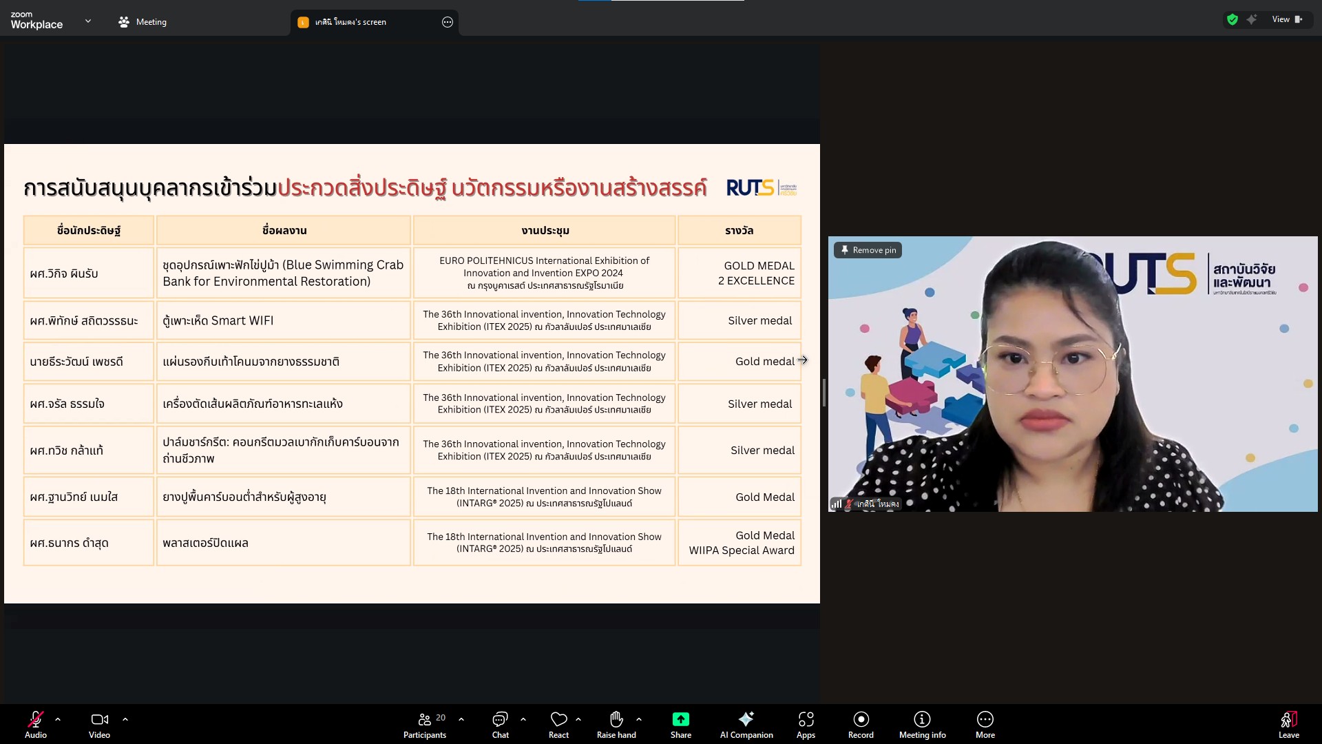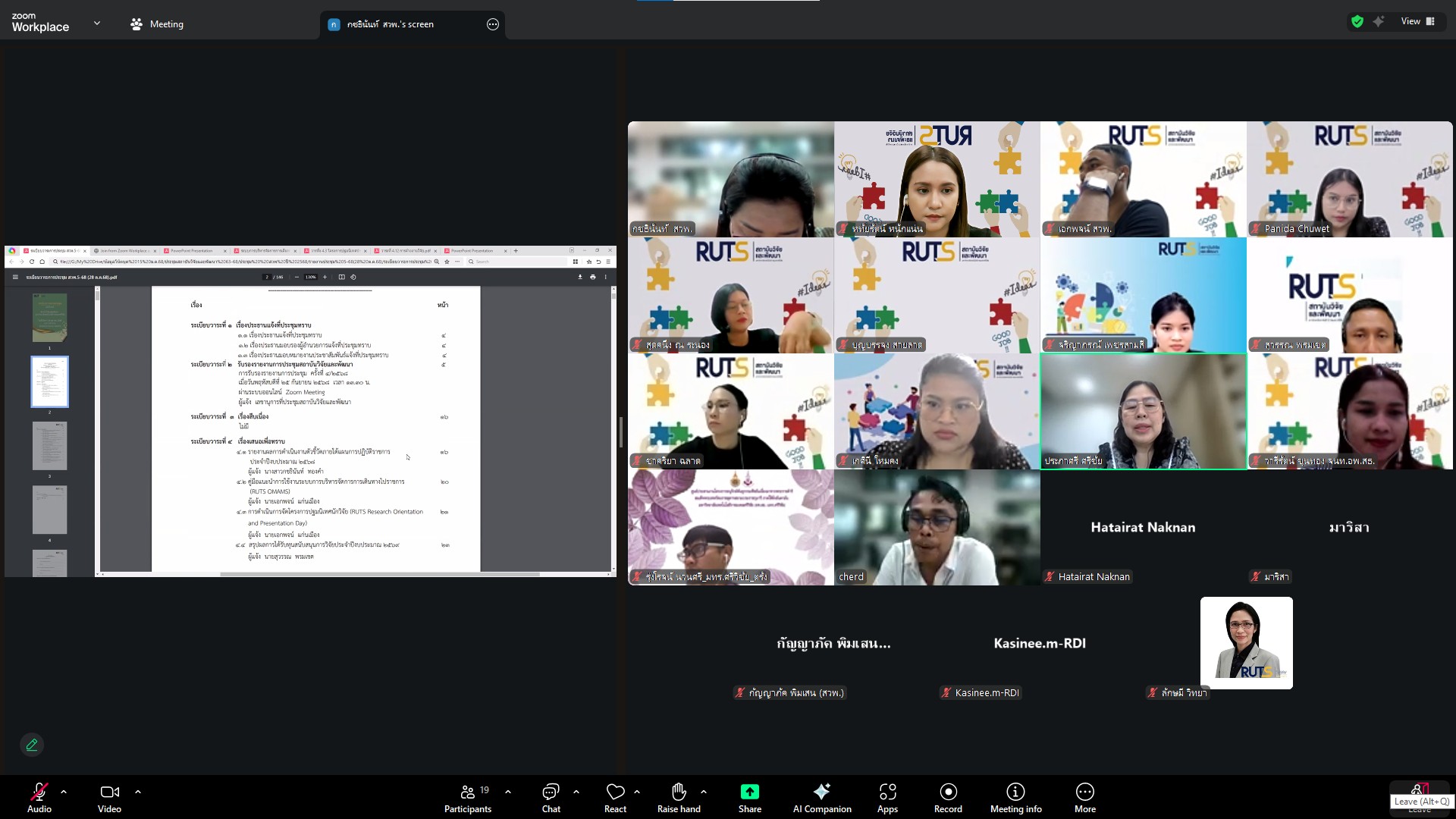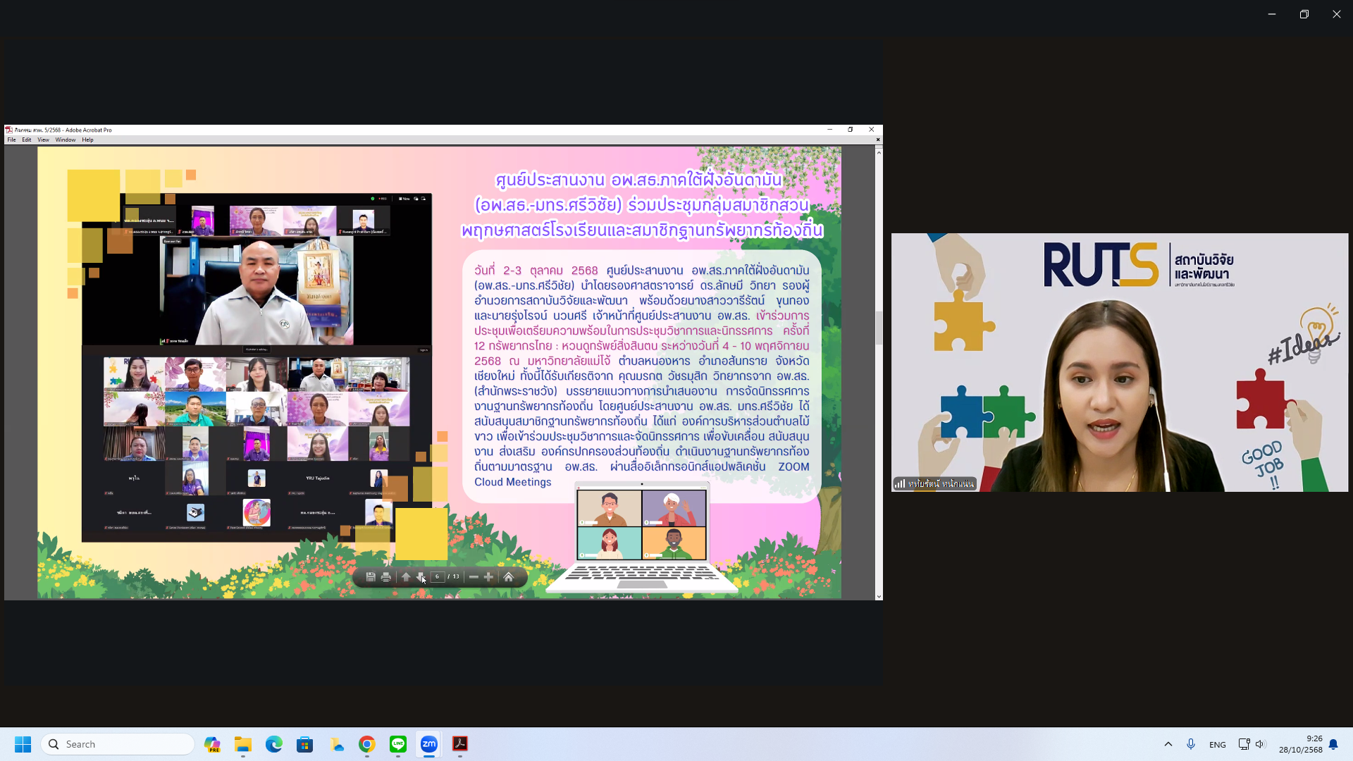 วันที่ 28 ตุลาคม 2568 สถาบันวิจัยและพัฒนา มทร.ศรีวิชัย นำโดย ผศ.ประภาศรี ศรีชัย ผู้อำนวยการสถาบันวิจัยและพัฒนา ผศ.ดร.สุดคนึง ณ ระนอง ผศ.ดร.ชาคริยา ฉลาด รศ.ดร.ลักษมี วิทยา รองผู้อำนวยการสถาบันวิจัยและพัฒนา พร้อมด้วยเจ้าหน้าที่ของสถาบันวิจัยและพัฒนา ประชุมตามระเบียบวาระการประชุม สถาบันวิจัยและพัฒนา มทร.ศรีวิชัย ครั้งที่ 5/2568 เพื่อติดตามการดำเนินงานด้านวิจัยของแต่ละฝ่ายงาน รวมถึงการวางแผนดำเนินโครงการของสถาบันวิจัยและพัฒนา ผ่านสื่ออิเล็กทรอนิกส์แอปพลิเคชั่น ZOOM Cloud Meetings