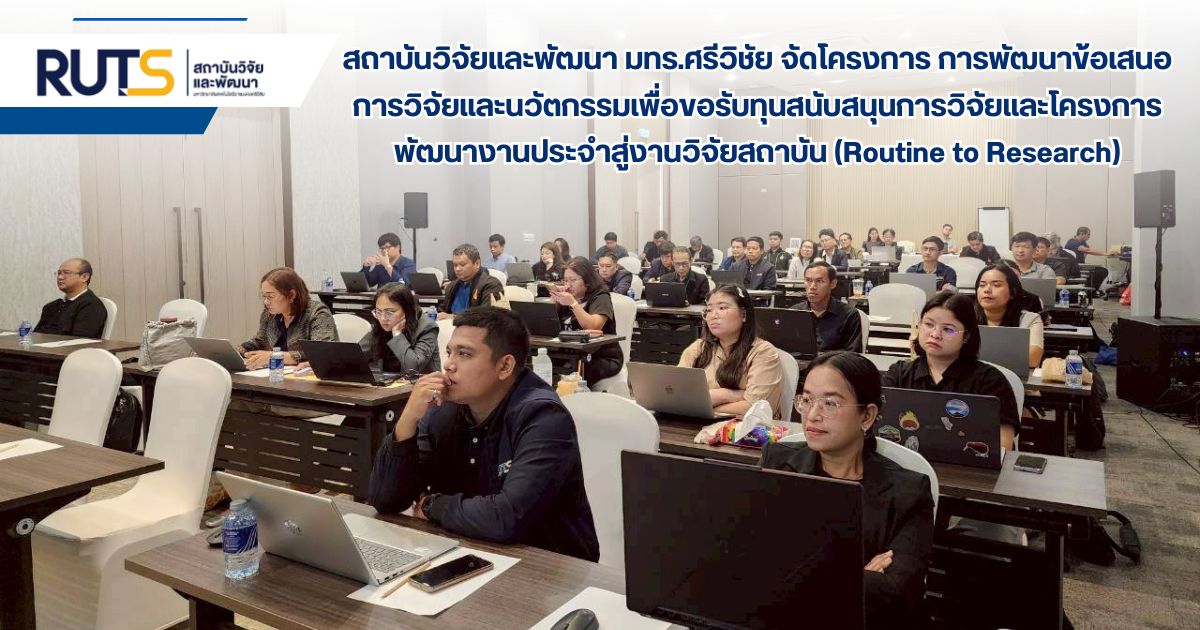 วันที่ 14 มกราคม 2569 สถาบันวิจัยและพัฒนา มทร.ศรีวิชัย จัดโครงการ การพัฒนาข้อเสนอการวิจัยและนวัตกรรมเพื่อขอรับทุนสนับสนุนการวิจัยและโครงการพัฒนางานประจำสู่งานวิจัยสถาบัน (Routine to Research) ณ โรงแรมสิทธินาถ แกรนด์วิว อำเภอเมืองพัทลุง จังหวัดพัทลุง โดยได้รับเกียรติจากผู้ช่วยศาสตราจารย์ประภาศรี ศรีชัย ผู้อำนวยการสถาบันวิจัยและพัฒนา เป็นประธานเปิดโครงการและผู้ช่วยศาสตราจารย์ ดร.ชาคริยา ฉลาด รองผู้อำนวยการสถาบันวิจัยและพัฒนา ฝ่ายวิชาการและถ่ายทอดเทคโนโลยี เป็นผู้กล่าวรายงาน โดยมีกิจกรรมประกอบด้วย บรรยาย เรื่อง “การทำวิจัยเพื่อก้าวสู่นักวิจัยมืออาชีพ” โดย ศาสตราจารย์ ดร.วรากร ลิ่มบุตร มหาวิทยาลัยสงขลานครินทร์ และกิจกรรม Work shop การเขียนข้อเสนอการวิจัย (Full Proposal) ซึ่งมีวิทยากรประจำกลุ่ม ดังนี้