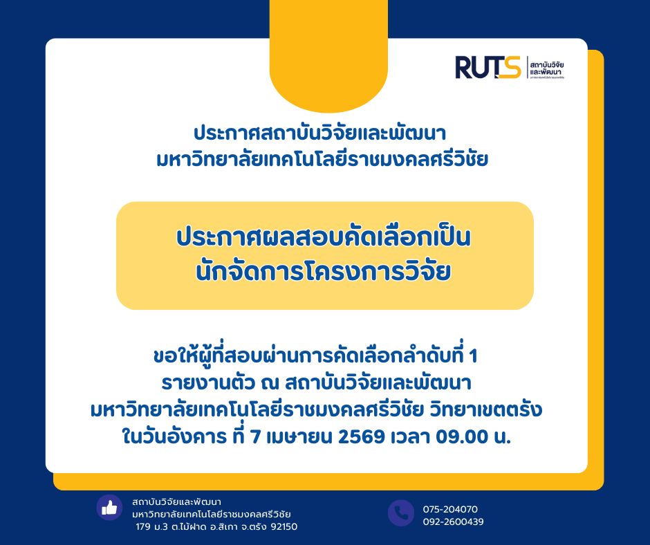 Highlights ประกาศสถาบันวิจัยและพัฒนา มหาวิทยาลัยเทคโนโลยีราชมงคลศรีวิชัย เรื่อง ผลการสอบคัดเลือกบุคคลเพื่อจ้างเหมาบริการ ตำแหน่งเจ้าหน้าที่ประจำโครงการสังกัด สถาบันวิจัยและพัฒนา มหาวิทยาลัยเทคโนโลยีราชมงคลศรีวิชัย ครั้งที่3/25683 กุมภาพันธ์ 20256 กุมภาพันธ์ 2025